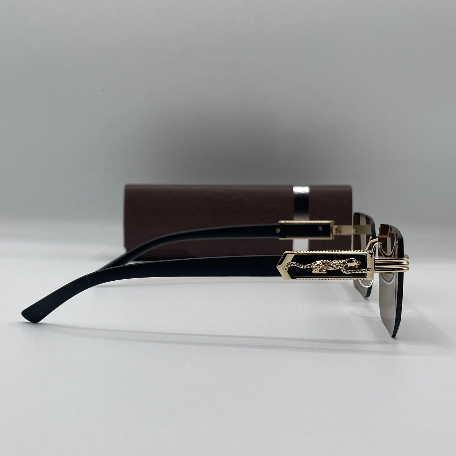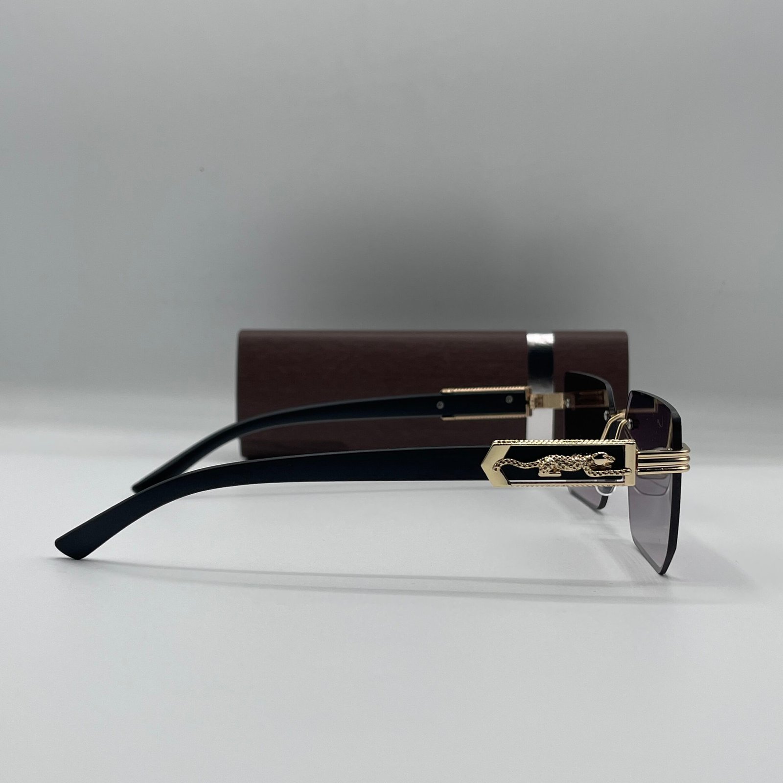 Elevate your style with the Panther Edge Royal, a luxurious fusion of bold design and refined craftsmanship. Featuring rimless square lenses, a sleek black temple, and intricate gold detailing with a panther emblem, these sunglasses are built to turn heads. The gradient-tinted lenses offer UV400 protection, making them both stylish and practical..